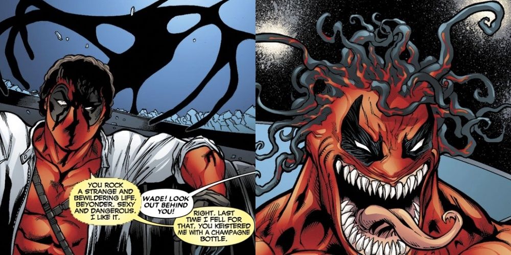 Karena Spider-Man hitam bikin keributan, supir limo Beyonder pun menembak Spidey keluar. Kemudian, symbiote otomatis terlepas dan menempel ke Deadpool. Saat itulah Deadpool berubah menjadi Venompool. Deadpool dan Venom jadi pahlawan yang konyol sekaligus mematikan.